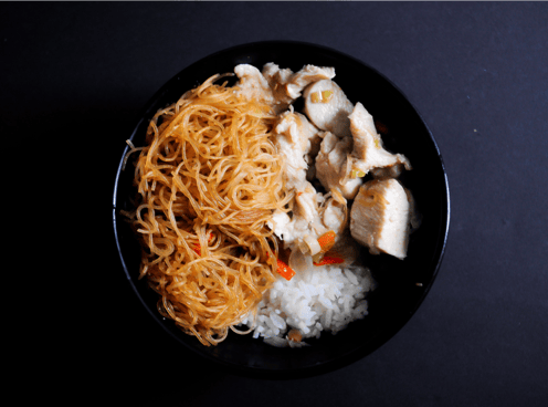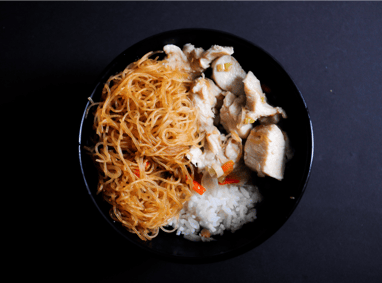 Modern fusion dish combining rice noodles with a classic rice bowl. Vegetarian option available.