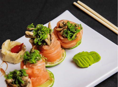 Avocado, lime, salmon, mushrooms and garnish served with pickled ginger and spring onions.