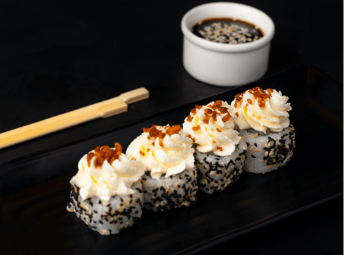 A modern classic. Sushi roll with salmon, avocado, cream cheese, and surimi sticks.